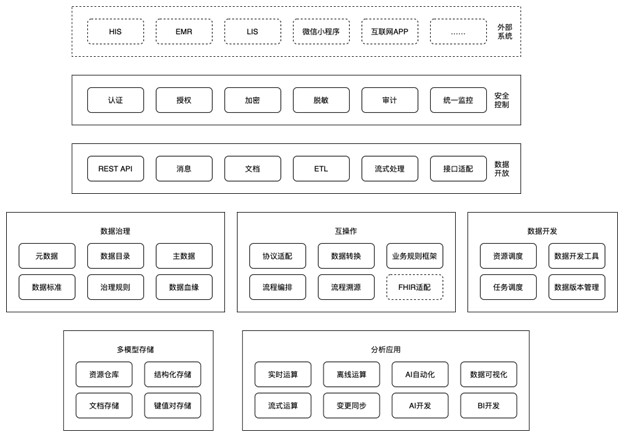 为解决医疗行业数据应用的难题,数据平台应运而生。数据平台不是一个业务系统,不基于特定业务的功能、性能需求。数据平台是一系列工具和能力的集合,这个集合提供了如何收集、清理、存储、转换、处理数据并提供给消费者的工具、流程模版和最佳实践。用户能够通过复用这些工具集,快速实现还未完成的数据流并获取高质量的数据集。这个体系允许组织实现数据驱动的业务并能支持快速迭代和变更。